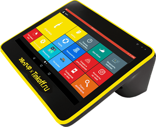 Онлайн-касса под ФЗ-54 на основе планшетного компьютера под цвета банка Тинькофф с фискальным накопителем на 15 месяцев.