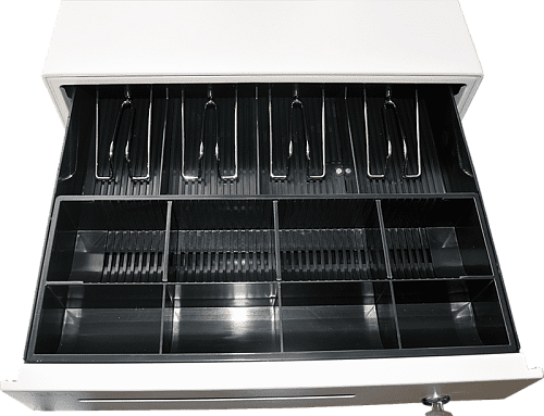 Механический денежный ящик Vioteh HVC-11 имеет трех позиционный замок и 4 отсека для купюр, и 8 для монет. Есть дополнительный скрытый отсек. Рассчитан на 1 000 000 циклов работы. Большой и функциональный денежный ящик с возможностью подключения любых типов ККТ от кассовый аппаратом до фискальных регистраторов.
